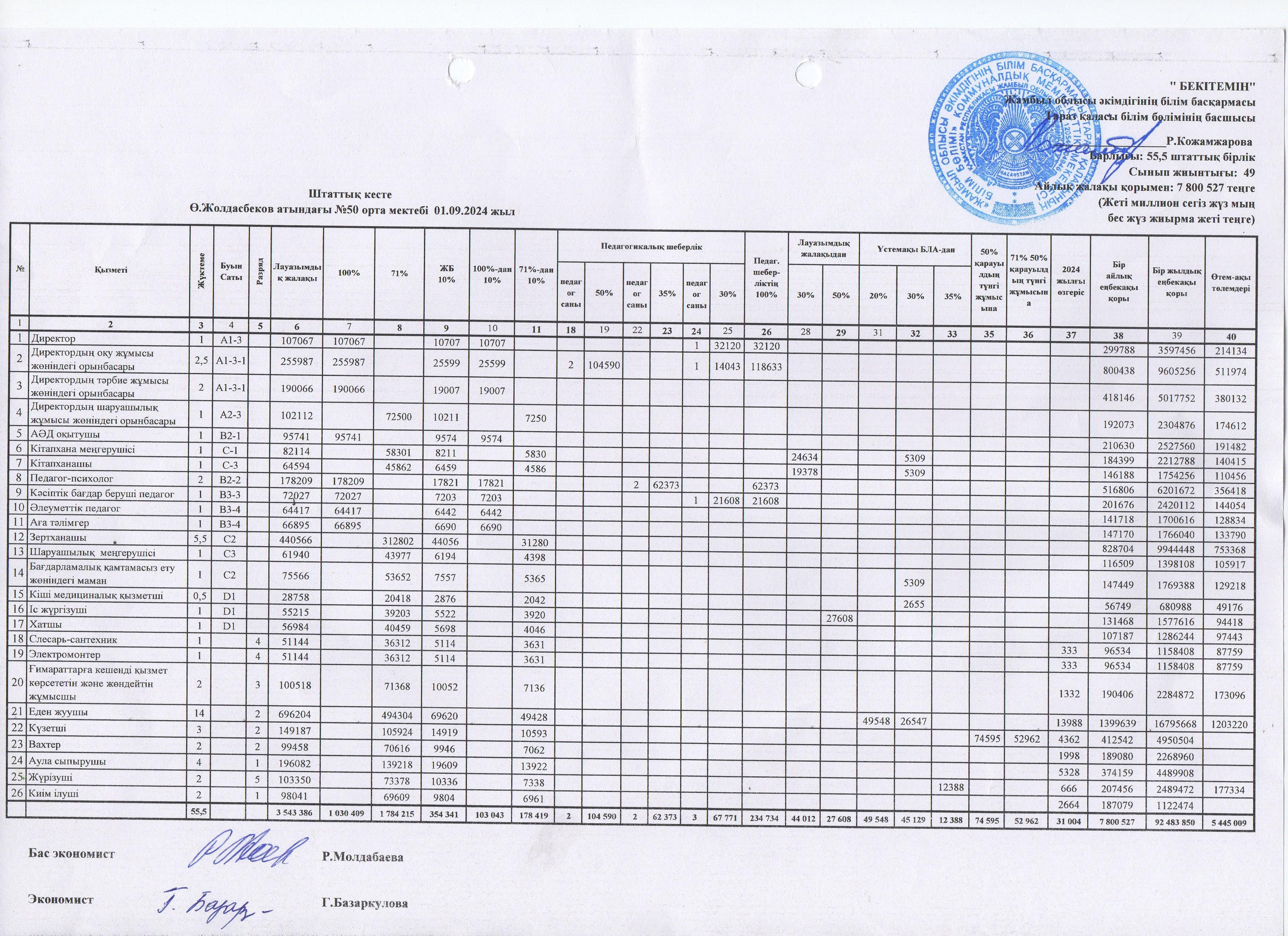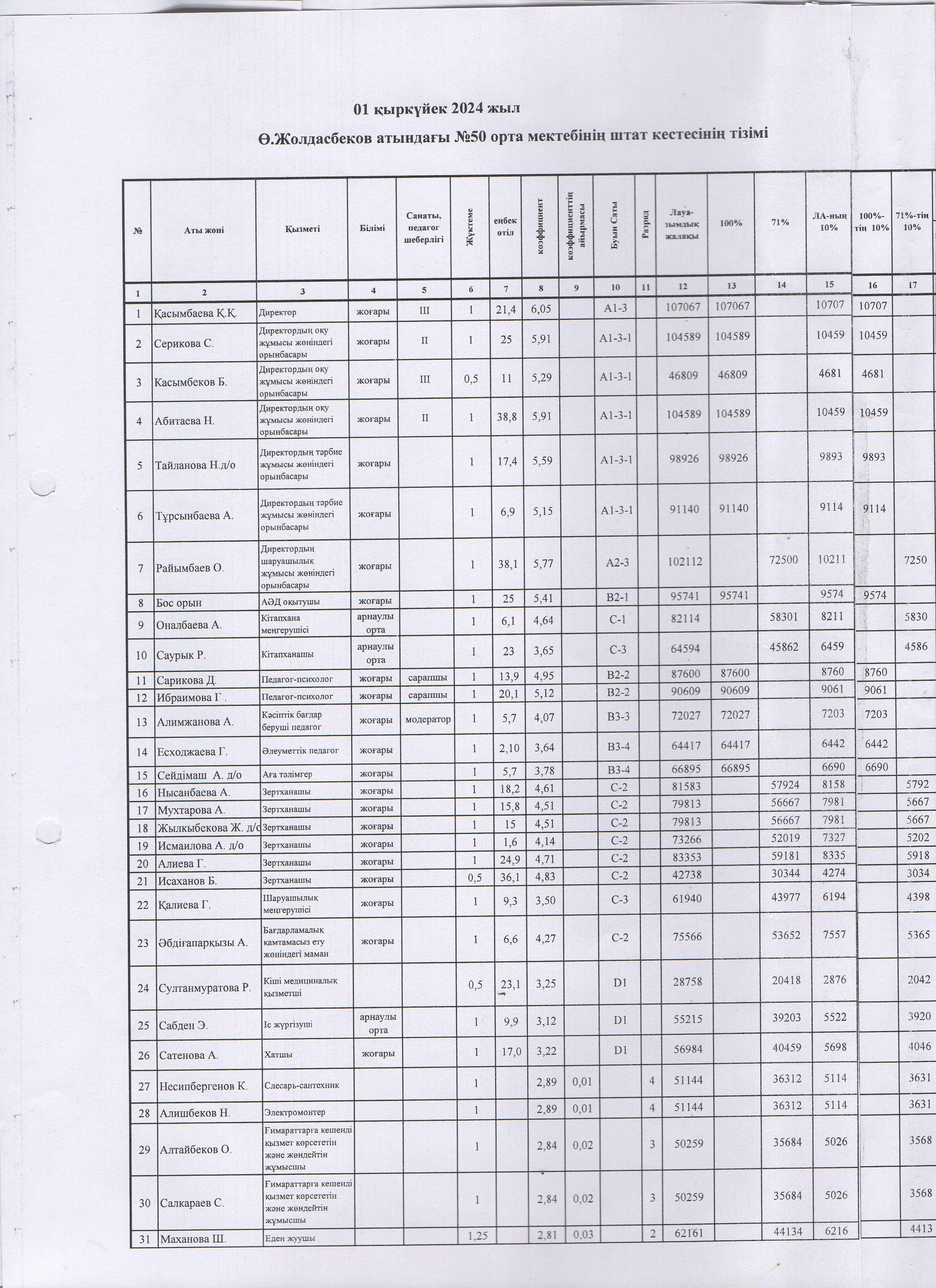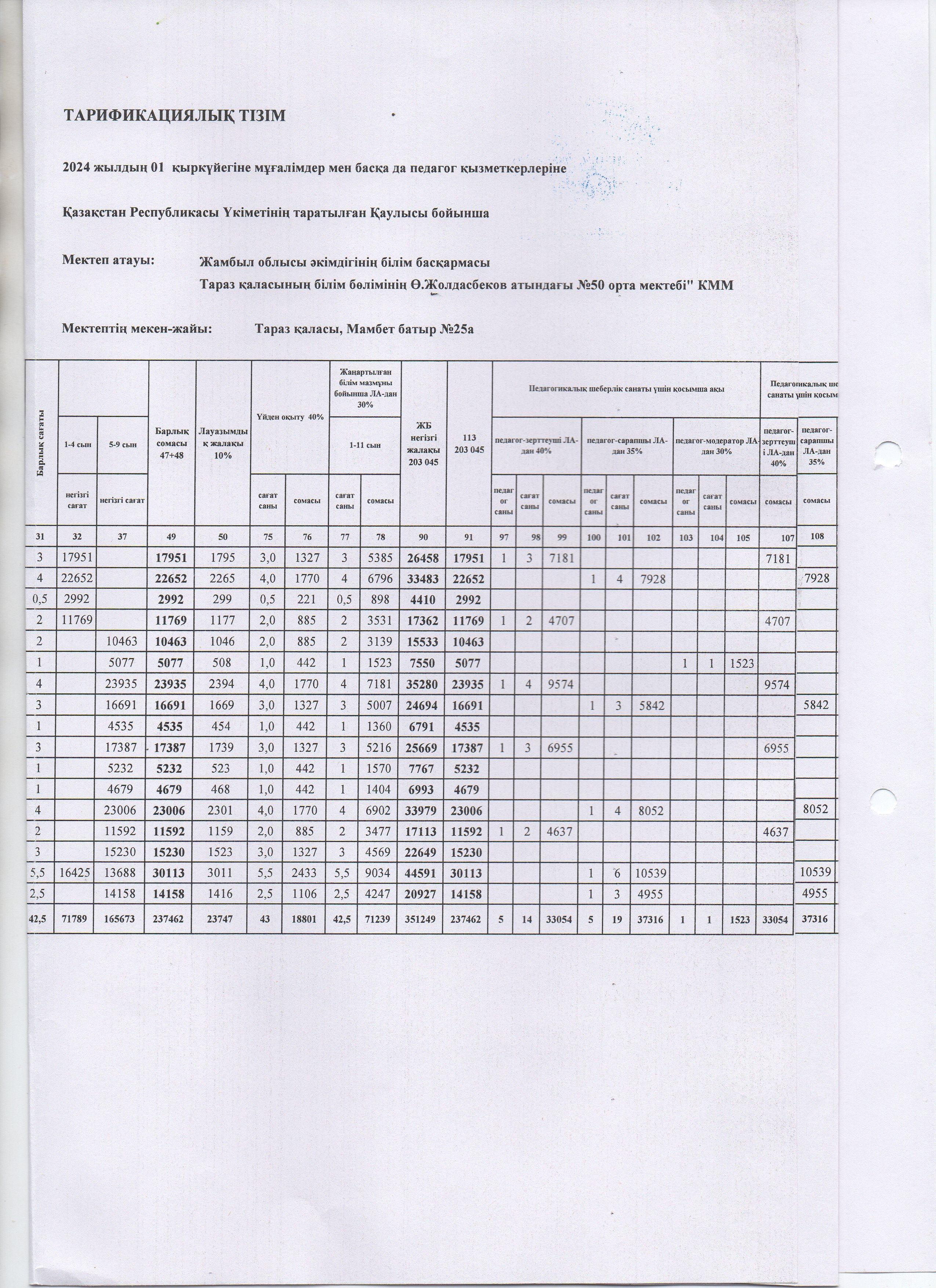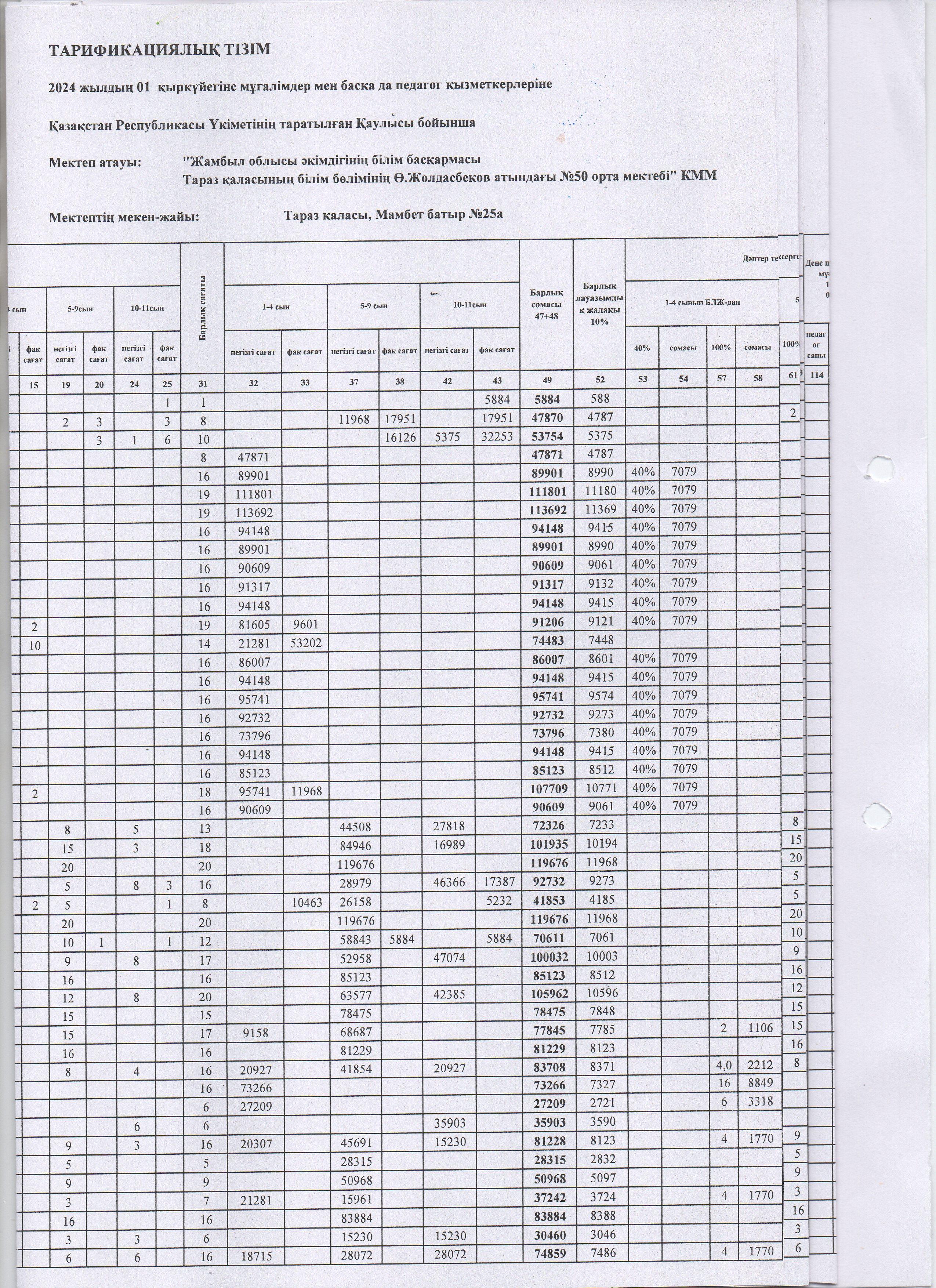 ТАРИФИКАЦИЯ, ШТАТТЫҚ КЕСТЕ 2024-2025 ҚЫРКҮЙЕК » СШ №50