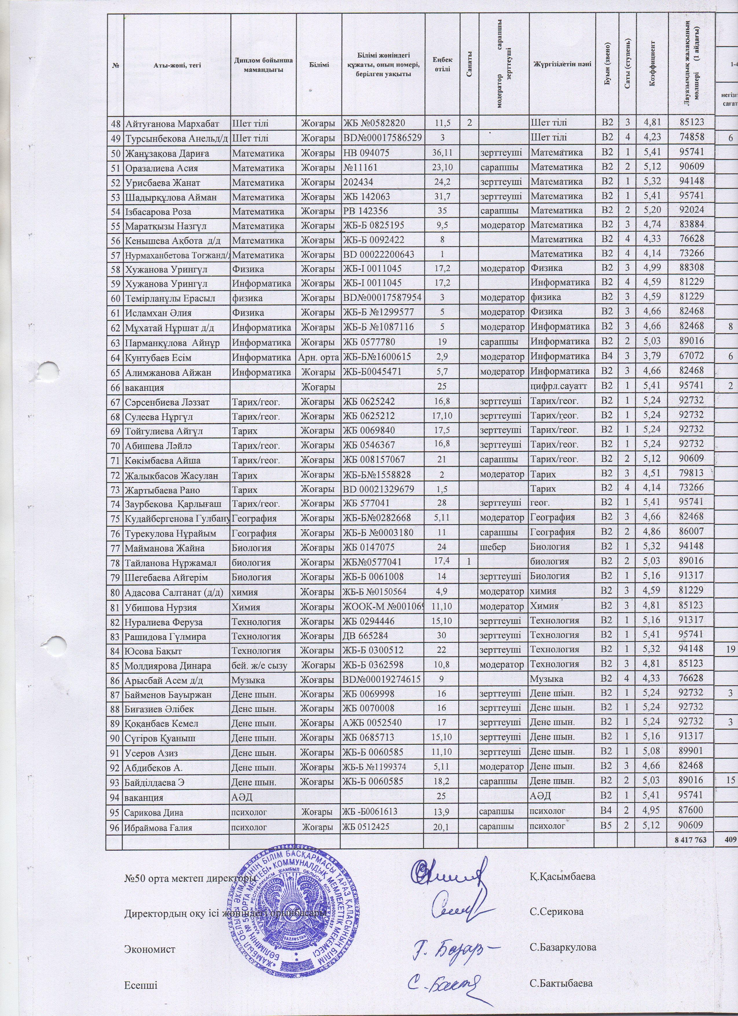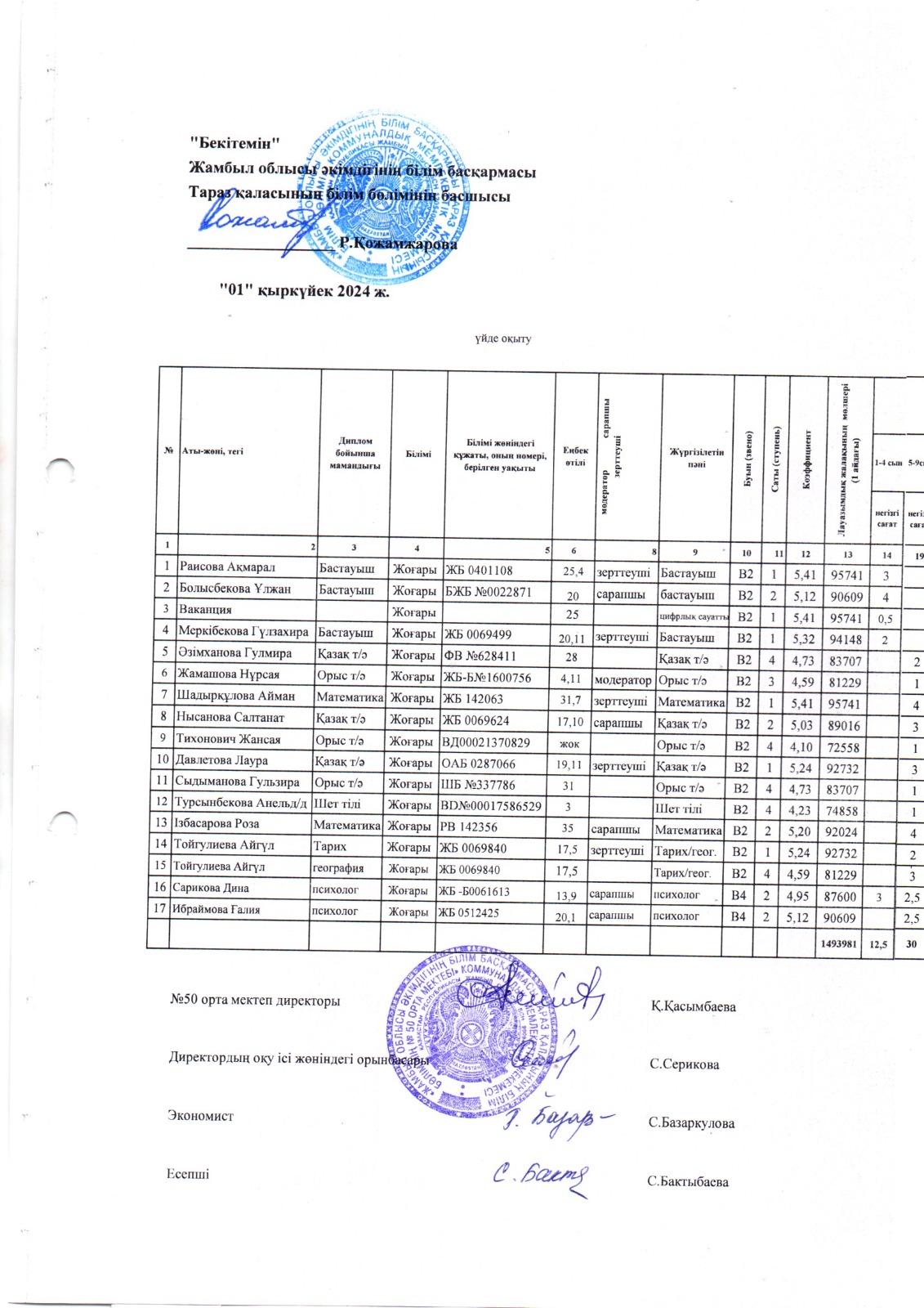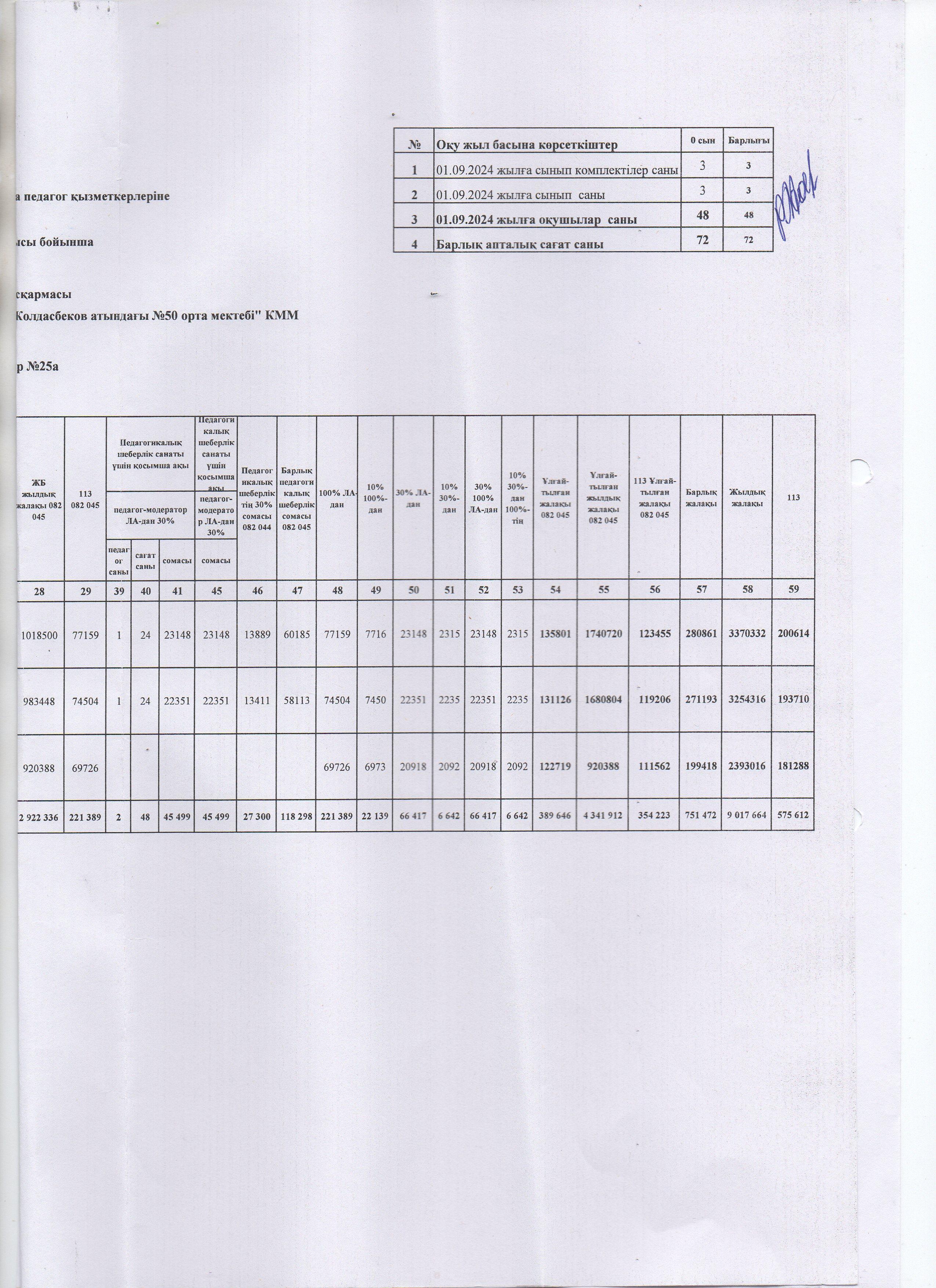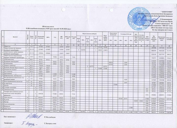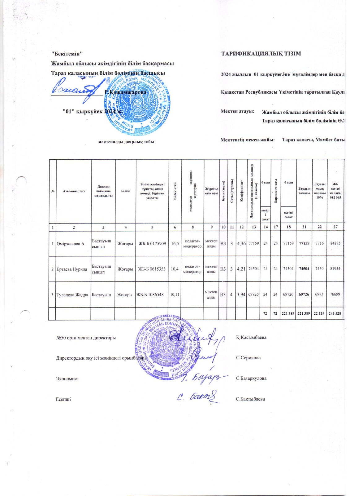 ТАРИФИКАЦИЯ, ШТАТТЫҚ КЕСТЕ 2024-2025 ҚЫРКҮЙЕК » СШ №50