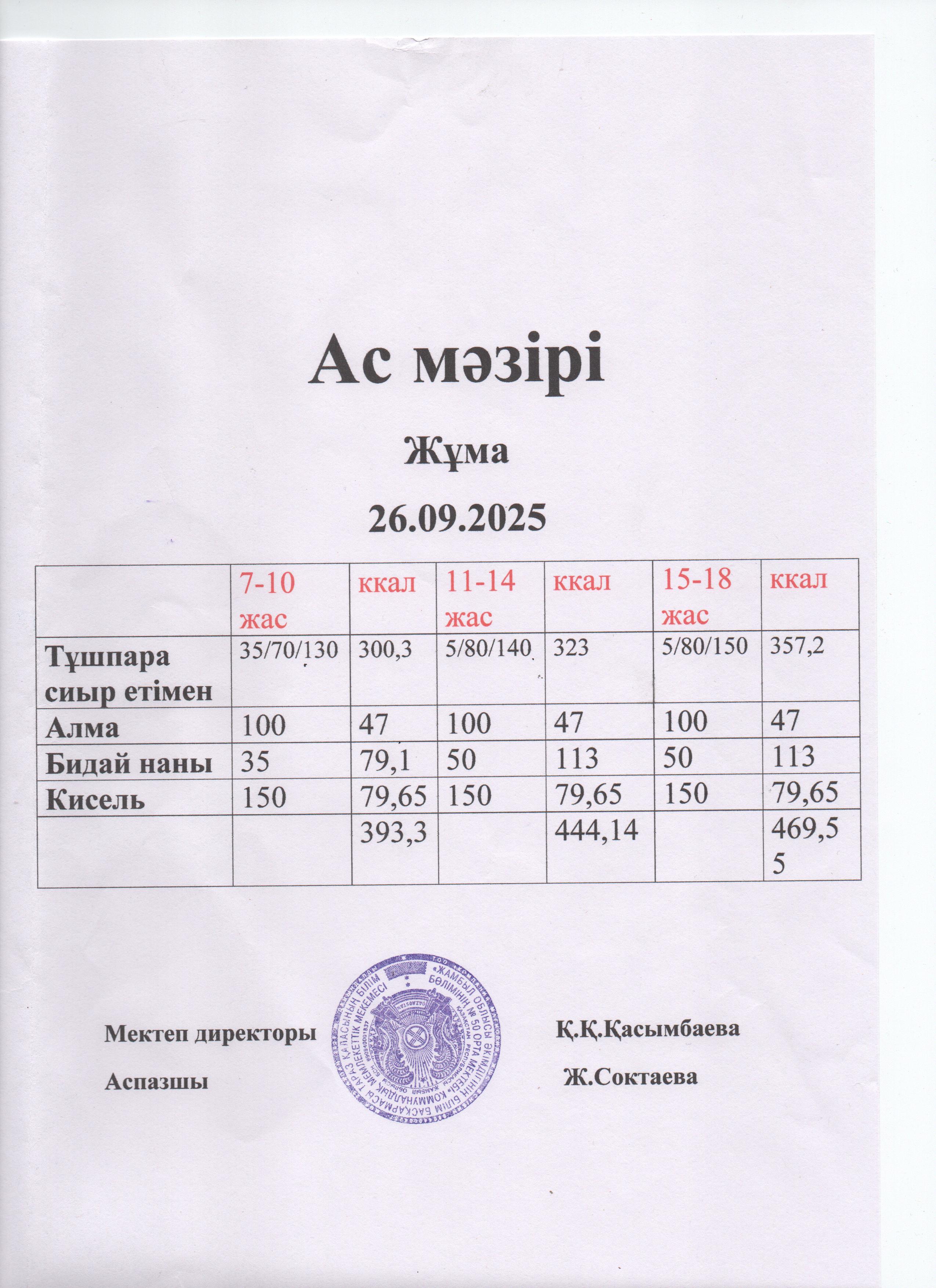 Ас мәзірі 26.09.2025 » СШ №50